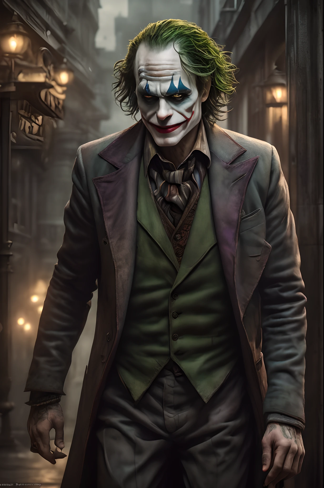 "Una figura inquietante con una sonrisa torcida y penetrante, el Joker se presenta con su característico maquillaje de rostro blanco, labios pintados de rojo intenso y ojos oscuros que transmiten una mezcla de locura y astucia. Su cabello verde desordenado cae alrededor de su rostro, mientras viste un traje púrpura llamativo que contrasta con el caos que lo rodea. La expresión en su rostro es a la vez burlona y desafiante, con una mirada que parece contemplar el próximo acto de su retorcido juego."